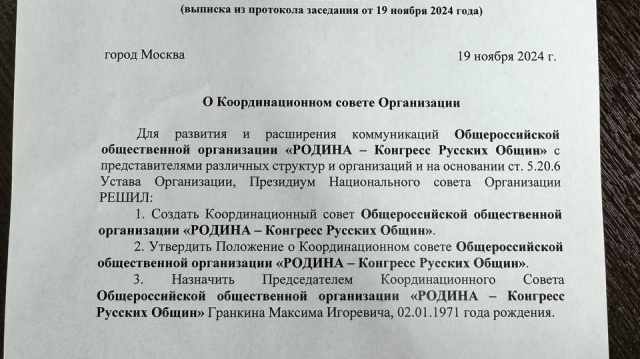 Общероссийская общественная организация "РОДИНА - Конгресс русских общин" объявила о создании Координационного совета.
