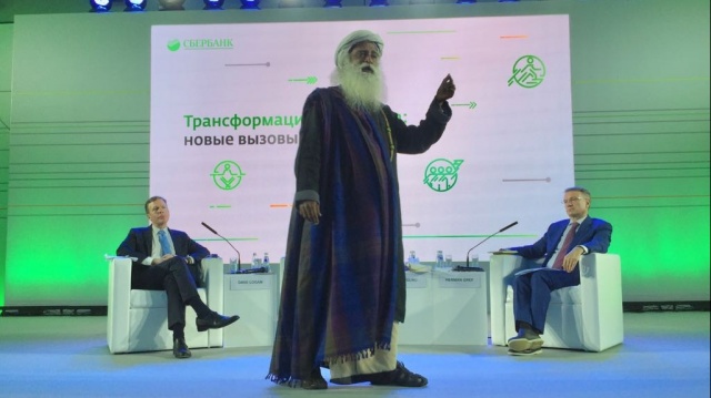 Индийский йог и религиозный проповедник Джагги Васудев (Садхгуру) провел 9 ноября лекцию для сотрудников Сбербанка. "На лекцию в Сбербанк его пригласил лично Герман Греф, рассказали The Bell источники, близкие к организаторам визита и к самому банку. Кроме лекции Садхгуру, по их словам, должен провести в банке несколько тренингов", - сообщает издание The Bell. Как видно на фото, Греф присутствует в кресле за спиной вещающего перед его сотрудниками индийского проповедника.