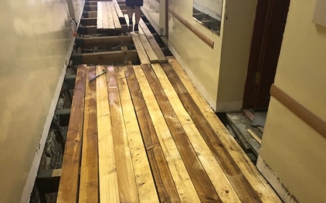 Рабочие полностью демонтировали старый пол, заменили все лаги, столбики опоры и настелили новые полы и уложили линолеум. Работа была закончена и принята комиссией. Качество ремонта не вызывает нареканий.