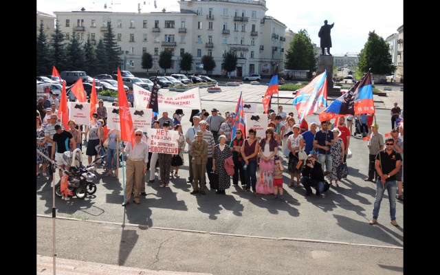Митинг собрал несколько сотен человек, которые пришли с единым призывом: не допустить распространение фашизма на территории братской страны. Наряду с российскими знамёнами над главной площадью города развевались флаги Донецкой и Луганской народных республик.