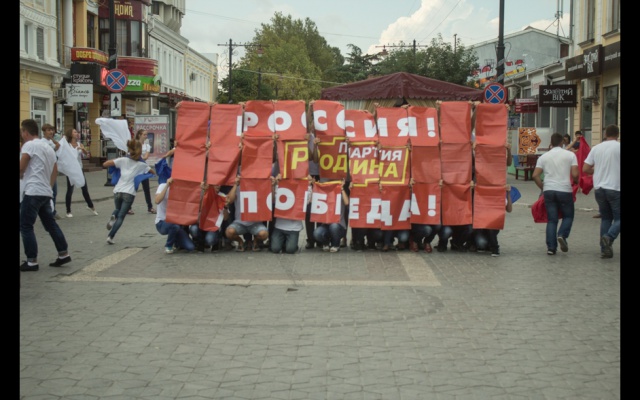 Около сотни молодых людей, танцуя под гимн России, развернули в центре крымской столицы российский флаг. Затем конструкция трансформировалась в полотно с изображением логотипа партии "РОДИНА".