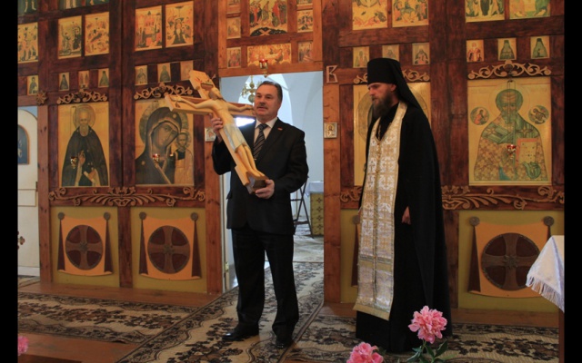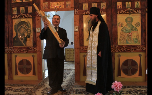 Шесть месяцев назад на меня спустилось озарение, вселилось в душу желание найти возможности и пути изготовить и доставить на мою малую родину в город Карачев, в этот монастырь копию Животворящего Креста Господня. По наставлению отца Никона на протяжении этого времени проводились работы, и сегодня, можно сказать, я исполнил ту миссию, на которую по воле Божией спустилось на меня озарение. Передаю в дар мужскому монастырю на вечное хранение эту святыню. Мы все просим отца Никона молиться за нас, за то, чтобы эта святыня всегда приносила всем верующим, всем прихожанам этого храма помощь Божию".