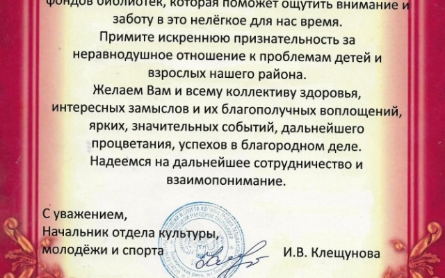 В документе за подписью начальника отдела культуры молодёжи и спорта администрации Тельмановского района Донецкой республики И. В. Клещуновой содержатся слова признательности за оказанную благотворительную помощь в пополнении фондов библиотек, неравнодушное отношение к проблемам детей и взрослых района в нелегкое для непризнанной республики время.